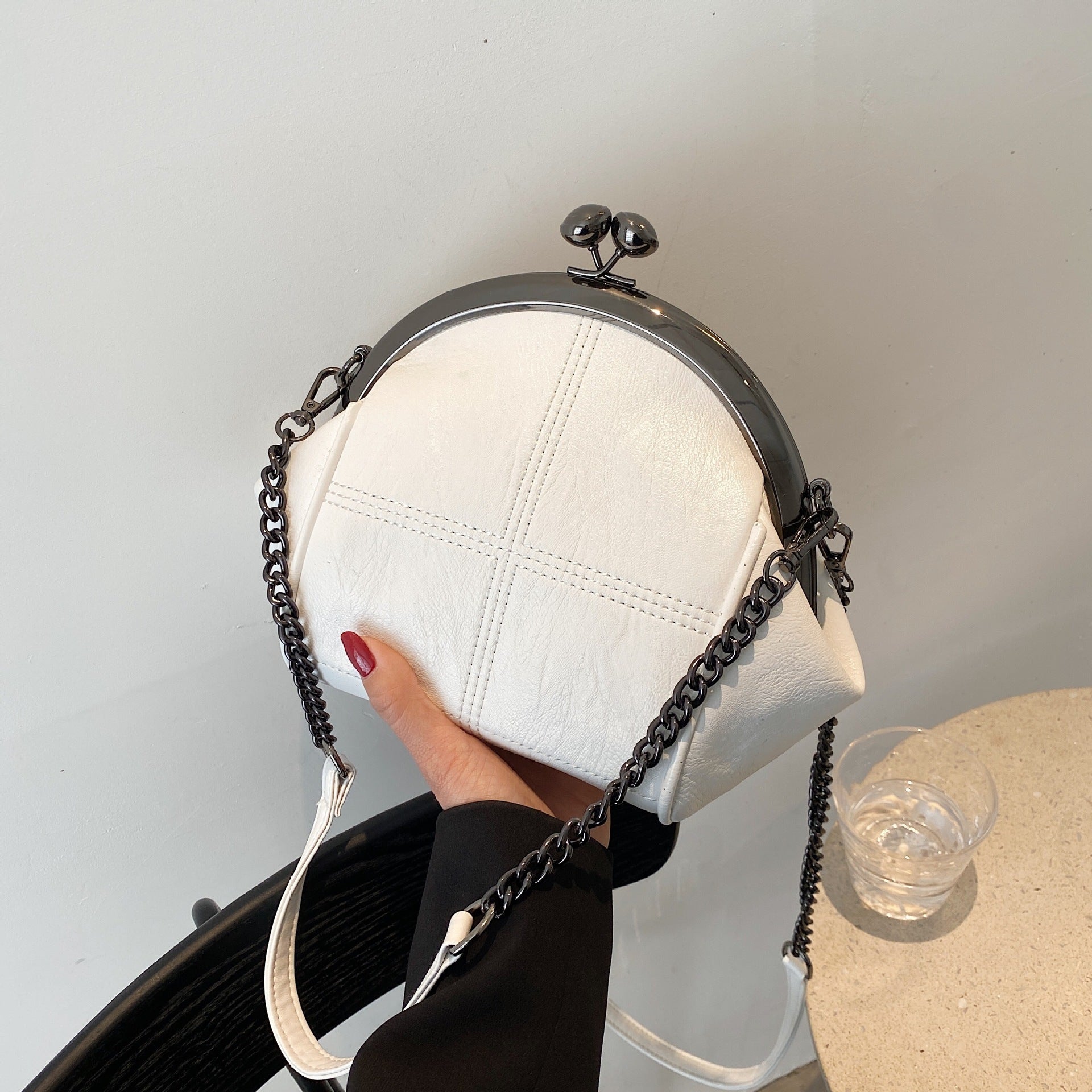 La fermeture à boule vintage apporte une touche rétro chic, tandis que la bandoulière en chaîne métallique ajoute un look audacieux et tendance à votre tenue.